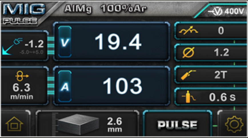 Huzal átmérő, védőgáz típusa, hegesztési taktus (2T 4T) megadása, áramerősség és huzal előtolás megadása.