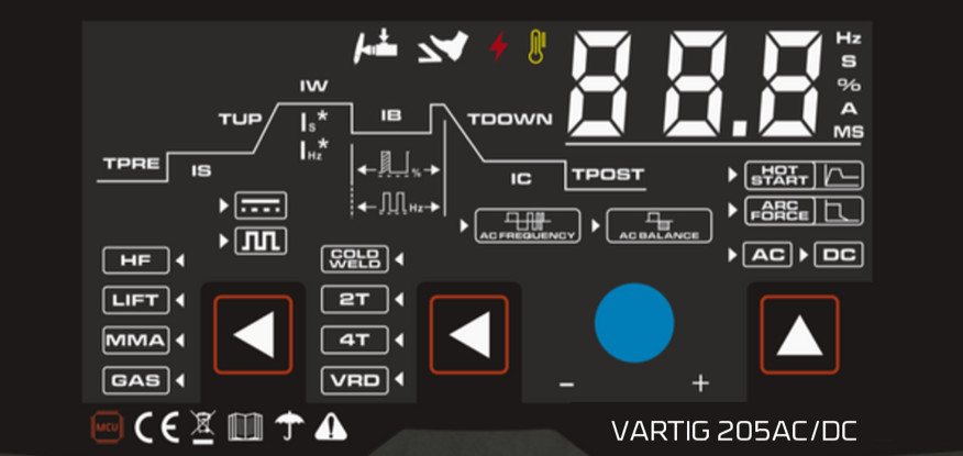 Hot-Start indítóáram beállítása, hegesztő áram beállítása, ARC-Force ívhossz szabályozás mértékének beállítása, a letapadás gátló funkció folyamatosan aktív MMA üzemmódban.
