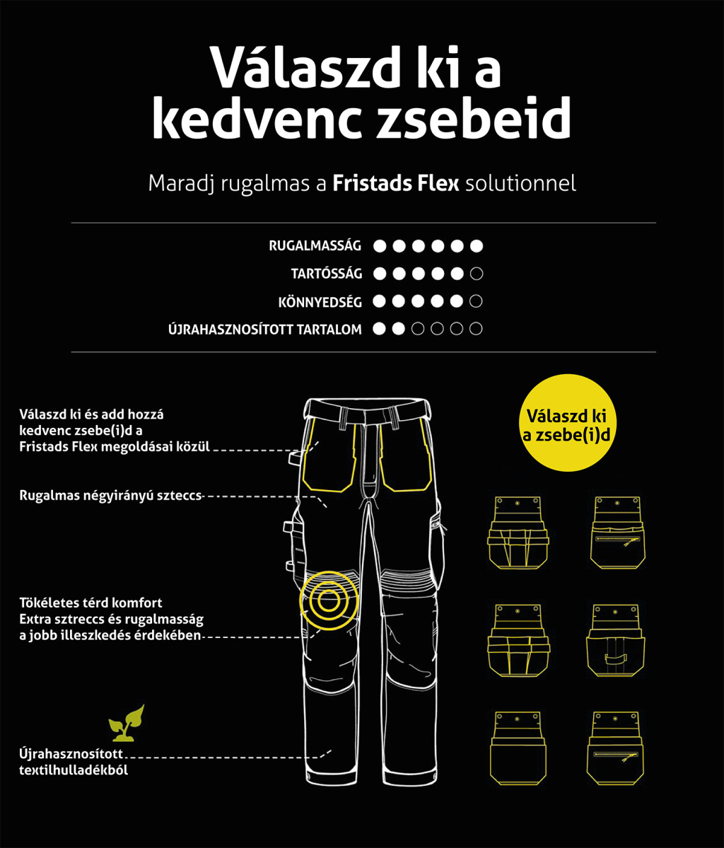Szakiparos nadrág teljes 4 irányú sztreccsből, amely lazán lógó zsebekkel egészíthető ki. A Fristads Flex Solution része, ahol a zsebek külön megvásárolhatók és mágneses gombokkal rögzíthetők, így személyre szabott nadrágot hozhatsz létre. Funkcionális munkanadrág tartós sztreccs anyagból, amely új szintre emeli a kényelmet és a mozgásszabadságot. A térdzsebek feletti rugalmas sztreccspanelek kényelmesebbé teszik a térdelést.